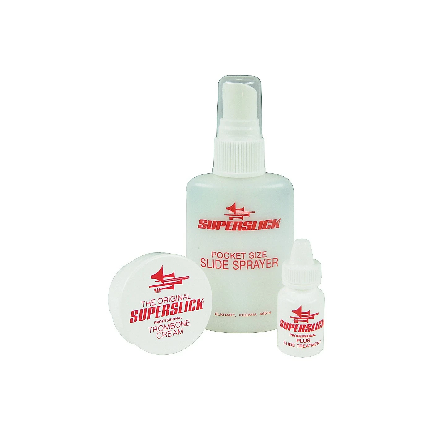 The Superslick Slick-It Trombone Kit contains Superslick Trombone Cream, Plus Slide Treatment, and Pocket Size Slide Sprayer.Superslick musical instrument care and maintenance products are designed, tested, and used by performing musicians. They provide dependable, long-lasting service when used as directed. Good design concepts, top-quality raw materials, and attention to detail help each Superslick product perform for you exactly as advertised.Superslick Trombone Cream is the cornerstone of Superslick’s 25-year reputation. Regular usage provides butter-smooth, silent slide action, day in, day out.For even smoother action use the silicon slide additive Plus Slide Treatment with Superslick Trombone Cream. Just a drop on each stocking enhances cream action and endurance.The Pocket Size Slide Sprayer is empy and is for use with water to activate lubricant on the slide.